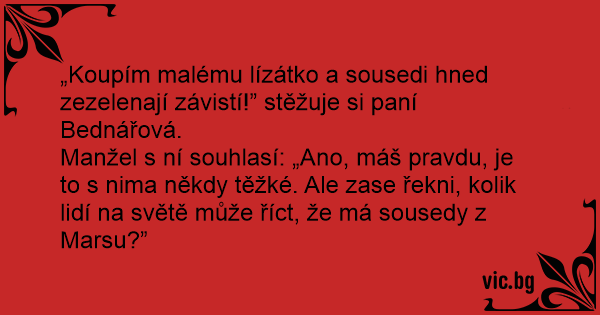 „Koupím malému lízátko a sousedi hned zezelenají závistí!” stěžuje si paní Bednářová.