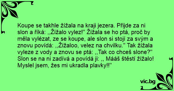 Koupe se takhle žížala na kraji jezera. Přijde za ni slon a říká: ,,Žížalo vylez!'' Žížala se hо ptá, proč by měla vylézat, ze se koupe, ale slon si stojí za svým a znovu povídá: ,,Žížaloo, velez na chvilku.'' Tak žížala vyleze z vody a znovu se ptá: ,,Tak co chceš slone?'' Slon se na ni zadívá a povídá ji: ,, Mááš štěstí žížalo! Myslel jsem, žes mi ukradla plavky!!''