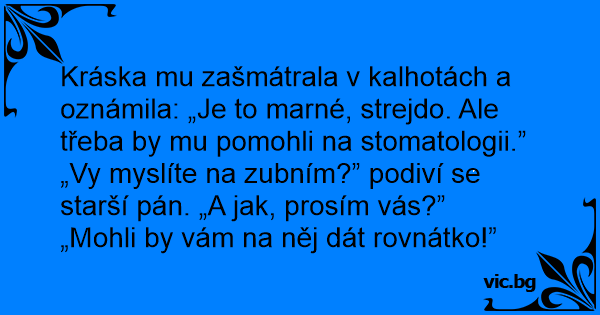 Kráska mu zašmátrala v kalhotách a oznámila: „Je to marné, strejdo. Ale třeba by mu pomohli na stomatologii.”