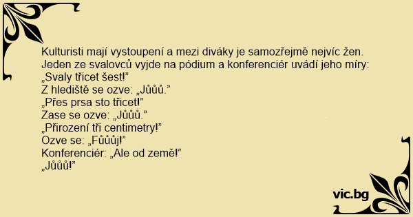 Kulturisti mají vystoupení a mezi diváky je samozřejmě nejvíc žen. Jeden ze svalovců vyjde na pódium a konferenciér uvádí jeho míry: „Svaly třicet šest!”