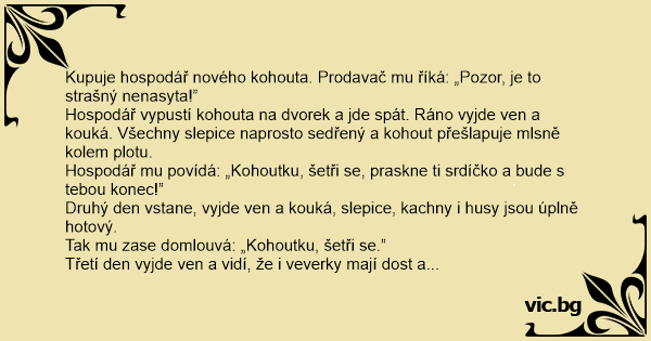 Kupuje hospodář nového kohouta. Prodavač mu říká: „Pozor, je to strašný nenasyta!”