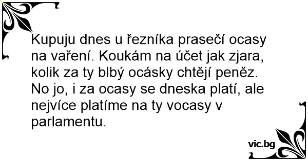 Kupuju dnes u řezníka prasečí ocasy na vaření. Koukám na účet jak zjara, kolik za ty blbý ocásky chtějí peněz. No jo, i za ocasy se dneska platí, ale nejvíce platíme na ty vocasy v parlamentu.