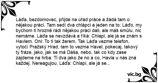 Láďa, bezdomovec, přijde na úřad práce a žádá tam o nějakou práci. Tam sedí dva chlápci a jeden na to: Láďo, my bychom ti hrozně rádi nějakou práci dali, ale máš smůlu, nic nemáme. Láďa se nevzdává a říká: Chlapi, ale já se znám s Havlem. Oni: To ti tak žerem. Tak Láďa vezme telefon, vytočí Pražský Hrad, tam to vezme Havel, pokecaj, takový ty fráze, jako, jak se má Dáša, nebo, tak co kdy zase zajdeme na hrba. Ti dva jako že no a co, Havla u nás zná každej. Nereagujou. Láďa: Chlapi, ale já se znám i s Billem Clintonem. Zase vytočí Bílý dům. Zase pokecaj (Jak se má Hillary,...). No a zas nic, ti dva nereagujou. Láďo, práci nedostaneš. Tak Láďa: Chlapi, ale já se znám i s papežem. Tak vezmou dodávku, dojedou do Vatikánu, tam papež zrovna slouží mši, plný kostel lidí. Láďa se pustí nahoru k oltáři, už zdálky volá: Nazdar Karle ! Papež hо uvidí, roztáhne ruce, objímají se, pokecaj, jak to jde a jak se má Bůh, ... Atd. Láďa se vrátí zpátky, tam stojí ti dva chlapi, úplně vodvařený, dolní čelisti spadlý až na hrudník, voči vykulený. Láďa na ně kouká: To jste tak hotový z toho, že se znám s papežem? Ne to ne, ale před chvilkou tudy šli dva Japonci, a ten jeden se ptal: Co je to za kreténa, co támhle stojí vedle Ládi?