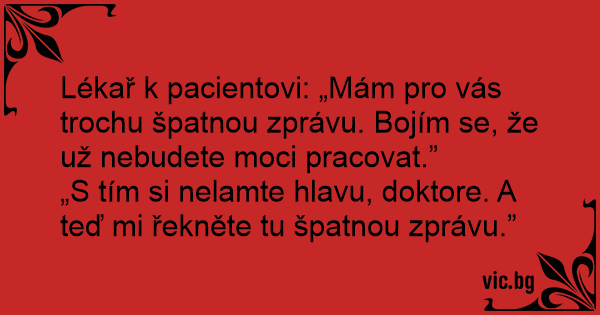 Lékař k pacientovi: „Mám pro vás trochu špatnou zprávu. Bojím se, že už nebudete moci pracovat.”
