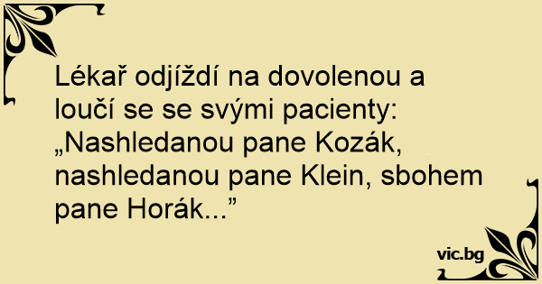 Lékař odjíždí na dovolenou a loučí se se svými pacienty: „Nashledanou pane Kozák, nashledanou pane Klein, sbohem pane Horák...”