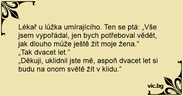 Lékař u lůžka umírajícího. Ten se ptá: „Vše jsem vypořádal, jen bych potřeboval vědět, jak dlouho může ještě žít moje žena.”