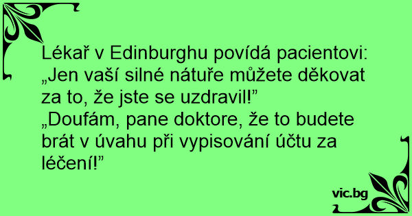 Lékař v Edinburghu povídá pacientovi: „Jen vaší silné nátuře můžete děkovat za to, že jste se uzdravil!”