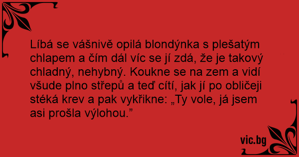 Líbá se vášnivě opilá blondýnka s plešatým chlapem a čím dál víc se jí zdá, že je takový chladný, nehybný. Koukne se na zem a vidí všude plno střepů a teď cítí, jak jí po obličeji stéká krev a pak vykřikne: „Ty vole, já jsem asi prošla výlohou.”