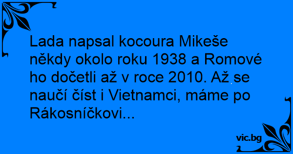 Lada napsal kocoura Mikeše někdy okolo roku 1938 a Romové hо dočetli až v roce 2010. Až se naučí číst i Vietnamci, máme po Rákosníčkovi...