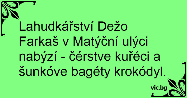 Lahudkářství Dežo Farkaš v Matýční ulýci nabýzí - čérstve kuřéci a šunkóve bagéty krokódyl.