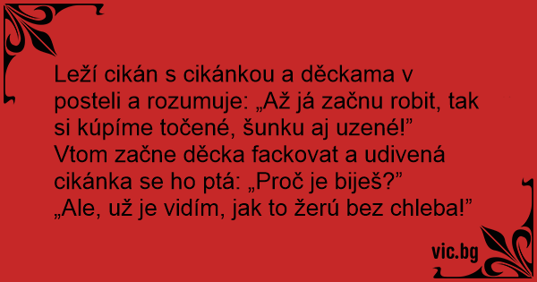 Leží cikán s cikánkou a děckama v posteli a rozumuje: „Až já začnu robit, tak si kúpíme točené, šunku aj uzené!”