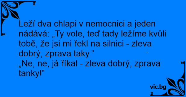 Leží dva chlapi v nemocnici a jeden nádává: „Ty vole, teď tady ležíme kvůli tobě, že jsi mi řekl na silnici - zleva dobrý, zprava taky.”