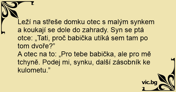 Leží na střeše domku otec s malým synkem a koukají se dole do zahrady. Syn se ptá otce: „Tati, proč babička utíká sem tam po tom dvoře?”
