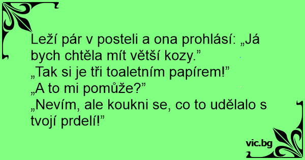 Leží pár v posteli a ona prohlásí: „Já bych chtěla mít větší kozy.”