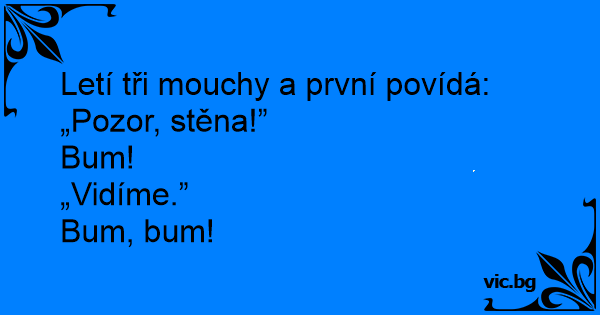 Letí tři mouchy a první povídá: „Pozor, stěna!”