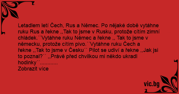 Letadlem letí Čech, Rus a Němec. Po nějaké době vytáhne ruku Rus a řekne ,,Tak to jsme v Rusku, protože cítím zimní chládek.´´Vytáhne ruku Němec a řekne ,, Tak to jsme v německu, protože cítím pivo.´´Vytáhne ruku Čech a řekne ,,Tak to jsme v Česku´´ Pilot se udiví a řekne ,,Jak jsi to poznal?´´ ,,Právě před chvilkou mi někdo ukradl hodinky´´............