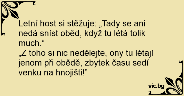 „Z toho si nic nedělejte, ony tu létají jenom při obědě, zbytek času sedí venku na hnojišti!”