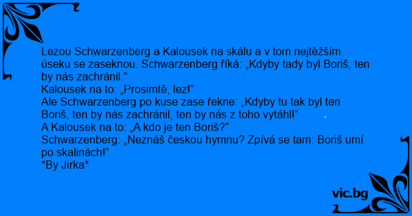 Lezou Schwarzenberg a Kalousek na skálu a v tom nejtěžším úseku se zaseknou. Schwarzenberg říká: „Kdyby tady byl Boriš, ten by nás zachránil.”