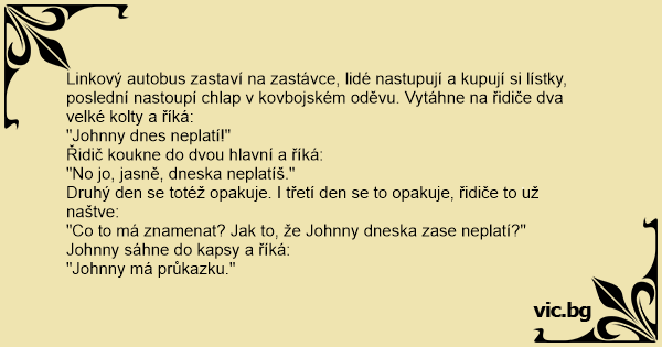 Linkový autobus zastaví na zastávce, lidé nastupují a kupují si lístky, poslední nastoupí chlap v kovbojském oděvu. Vytáhne na řidiče dva velké kolty a říká: