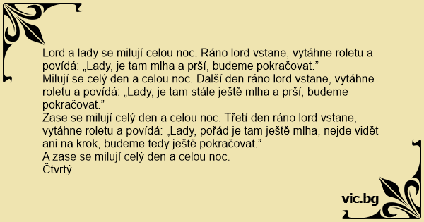 Milují se celý den a celou noc. Další den ráno lord vstane, vytáhne roletu a povídá: „Lady, je tam stále ještě mlha a prší, budeme pokračovat.”