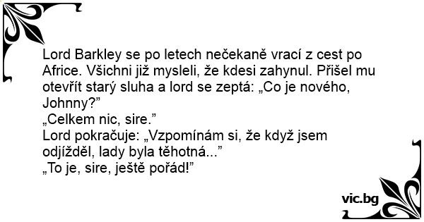 Lord Barkley se po letech nečekaně vrací z cest po Africe. Všichni již mysleli, že kdesi zahynul. Přišel mu otevřít starý sluha a lord se zeptá: „Co je nového, Johnny?”