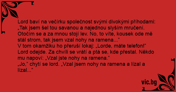 „Jo,” chytí se lord. „Vzal jsem nohy na ramena a lízal a lízal...”