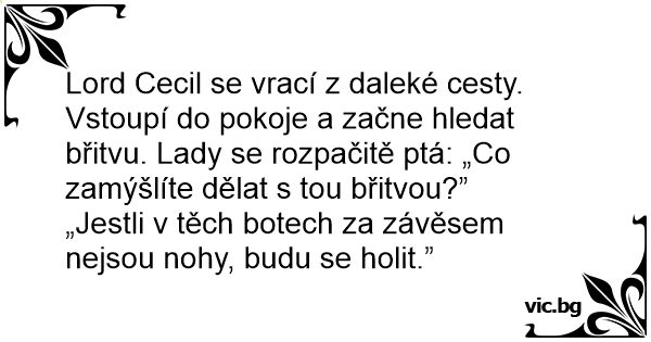 Lord Cecil se vrací z daleké cesty. Vstoupí do pokoje a začne hledat břitvu. Lady se rozpačitě ptá: „Co zamýšlíte dělat s tou břitvou?”