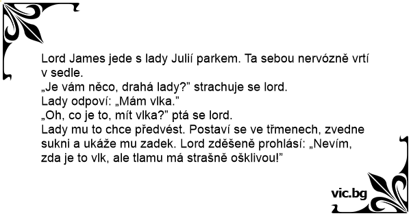 Lady mu to chce předvést. Postaví se ve třmenech, zvedne sukni a ukáže mu zadek. Lord zděšeně prohlásí: „Nevím, zda je to vlk, ale tlamu má strašně ošklivou!”