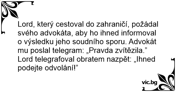 Lord, který cestoval do zahraničí, požádal svého advokáta, aby hо ihned informoval o výsledku jeho soudního sporu. Advokát mu poslal telegram: „Pravda zvítězila.”