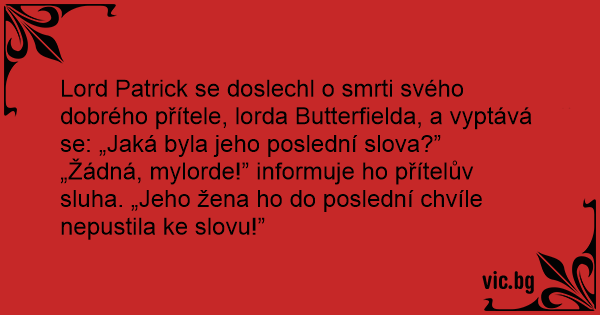Lord Patrick se doslechl o smrti svého dobrého přítele, lorda Butterfielda, a vyptává se: „Jaká byla jeho poslední slova?”