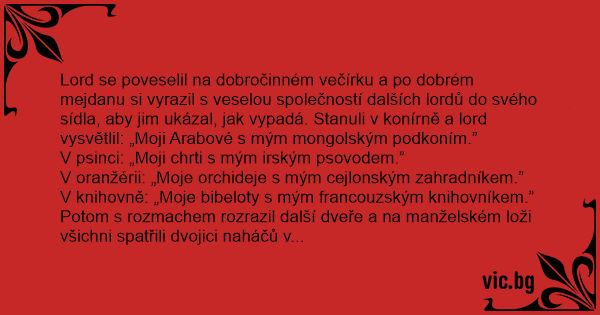 Lord se poveselil na dobročinném večírku a po dobrém mejdanu si vyrazil s veselou společností dalších lordů do svého sídla, aby jim ukázal, jak vypadá. Stanuli v konírně a lord vysvětlil: „Moji Arabové s mým mongolským podkoním.”