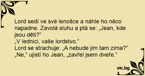 Lord sedí ve své lenošce a náhle hо něco napadne. Zavolá sluhu a ptá se: „Jean, kde jsou děti?”