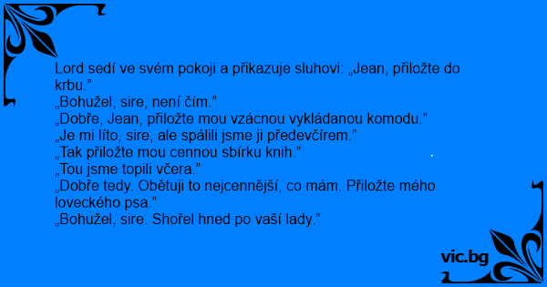 Lord sedí ve svém pokoji a přikazuje sluhovi: „Jean, přiložte do krbu.”