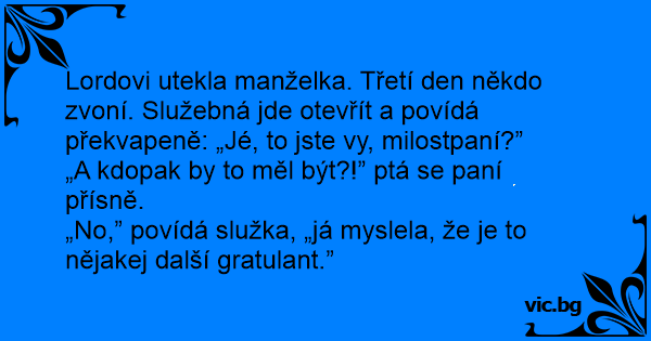 Lordovi utekla manželka. Třetí den někdo zvoní. Služebná jde otevřít a povídá překvapeně: „Jé, to jste vy, milostpaní?”