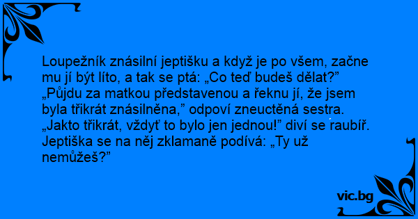 Loupežník znásilní jeptišku a když je po všem, začne mu jí být líto, a tak se ptá: „Co teď budeš dělat?”