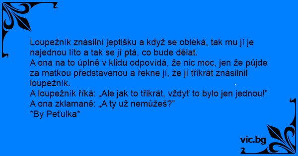 A ona na to úplně v klidu odpovídá, že nic moc, jen že půjde za matkou představenou a řekne jí, že jí třikrát znásilnil loupežník.