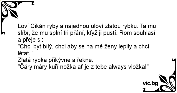Loví Cikán ryby a najednou uloví zlatou rybku. Ta mu slíbí, že mu splní tři přání, kfyž ji pustí. Rom souhlasí a přeje si: