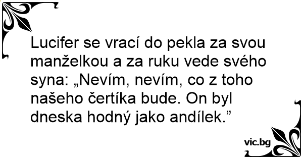 Lucifer se vrací do pekla za svou manželkou a za ruku vede svého syna: „Nevím, nevím, co z toho našeho čertíka bude. On byl dneska hodný jako andílek.”