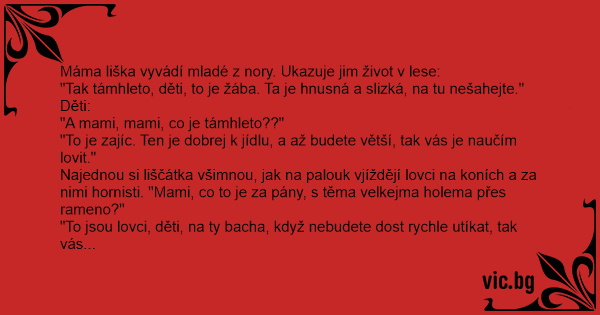 Najednou si liščátka všimnou, jak na palouk vjíždějí lovci na koních a za nimi hornisti. "Mami, co to je za pány, s těma velkejma holema přes rameno?"
