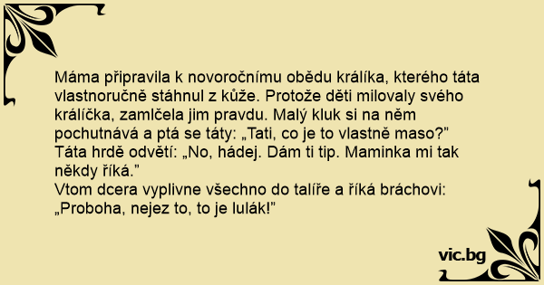 Máma připravila k novoročnímu obědu králíka, kterého táta vlastnoručně stáhnul z kůže. Protože děti milovaly svého králíčka, zamlčela jim pravdu. Malý kluk si na něm pochutnává a ptá se táty: „Tati, co je to vlastně maso?”