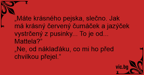 „Máte krásného pejska, slečno. Jak má krásný červený čumáček a jazýček vystrčený z pusinky... To je od... Mattela?”