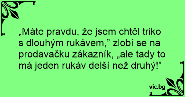 „Máte pravdu, že jsem chtěl triko s dlouhým rukávem,” zlobí se na prodavačku zákazník, „ale tady to má jeden rukáv delší než druhý!”