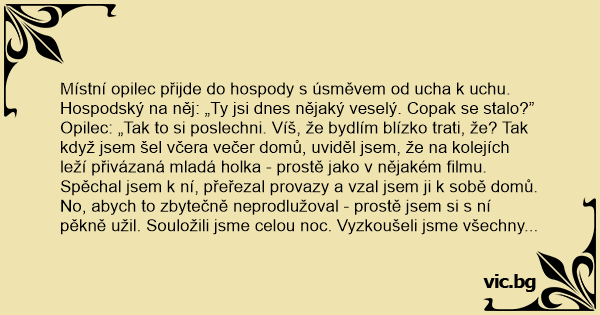 Opilec: „Tak to si poslechni. Víš, že bydlím blízko trati, že? Tak když jsem šel včera večer domů, uviděl jsem, že na kolejích leží přivázaná mladá holka - prostě jako v nějakém filmu. Spěchal jsem k ní, přeřezal provazy a vzal jsem ji k sobě domů. No, abych to zbytečně neprodlužoval - prostě jsem si s ní pěkně užil. Souložili jsme celou noc. Vyzkoušeli jsme všechny místnosti v baráku a vyzkoušeli jsme všechny možné polohy.”