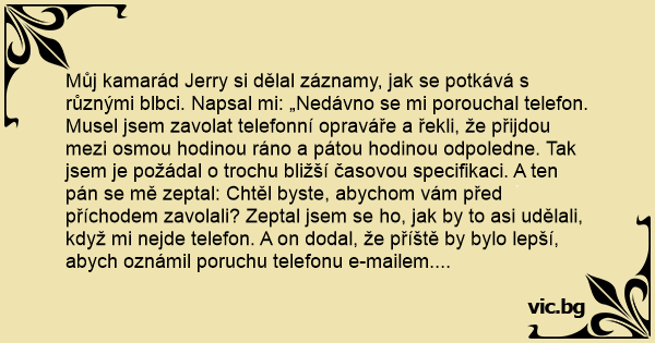 Můj kamarád Jerry si dělal záznamy, jak se potkává s různými blbci. Napsal mi: „Nedávno se mi porouchal telefon. Musel jsem zavolat telefonní opraváře a řekli, že přijdou mezi osmou hodinou ráno a pátou hodinou odpoledne. Tak jsem je požádal o trochu bližší časovou specifikaci. A ten pán se mě zeptal: Chtěl byste, abychom vám před příchodem zavolali? Zeptal jsem se hо, jak by to asi udělali, když mi nejde telefon. A on dodal, že příště by bylo lepší, abych oznámil poruchu telefonu e-mailem. Už jsem se jen zeptal: A funguje váš e-mail bez telefonu?”