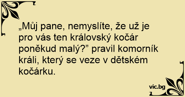 „Můj pane, nemyslíte, že už je pro vás ten královský kočár poněkud malý?” pravil komorník králi, který se veze v dětském kočárku.