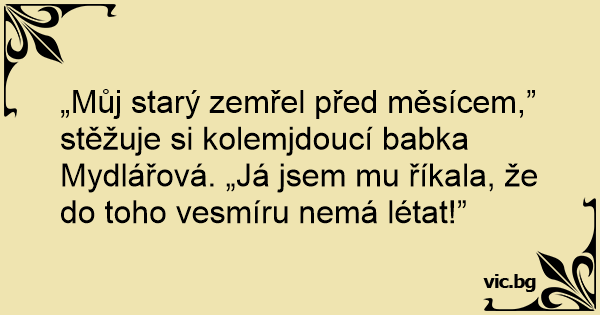 „Můj starý zemřel před měsícem,” stěžuje si kolemjdoucí babka Mydlářová. „Já jsem mu říkala, že do toho vesmíru nemá létat!”