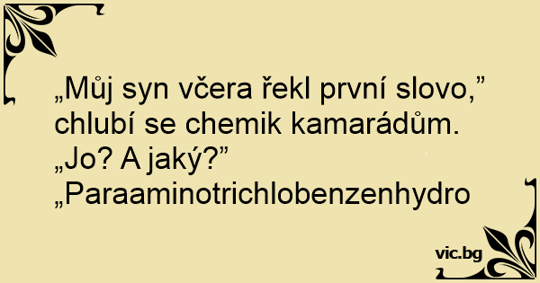 „Můj syn včera řekl první slovo,” chlubí se chemik kamarádům.