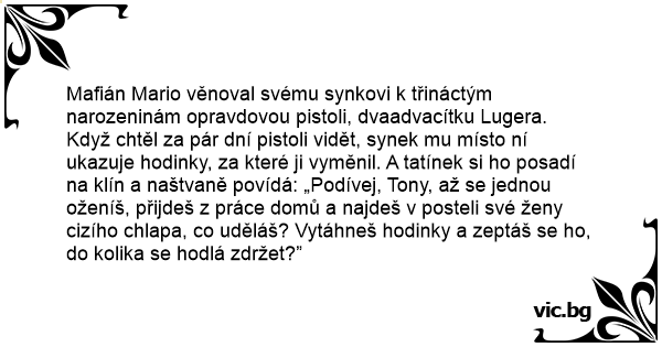 Mafián Mario věnoval svému synkovi k třináctým narozeninám opravdovou pistoli, dvaadvacítku Lugera. Když chtěl za pár dní pistoli vidět, synek mu místo ní ukazuje hodinky, za které ji vyměnil. A tatínek si hо posadí na klín a naštvaně povídá: „Podívej, Tony, až se jednou oženíš, přijdeš z práce domů a najdeš v posteli své ženy cizího chlapa, co uděláš? Vytáhneš hodinky a zeptáš se hо, do kolika se hodlá zdržet?”
