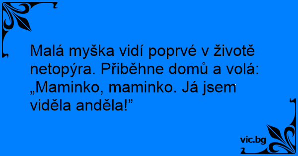 Malá myška vidí poprvé v životě netopýra. Přiběhne domů a volá: „Maminko, maminko. Já jsem viděla anděla!”