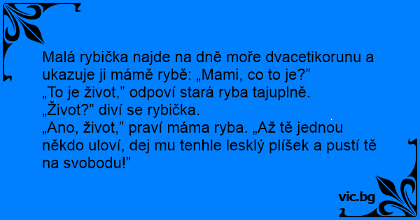 „Ano, život,” praví máma ryba. „Až tě jednou někdo uloví, dej mu tenhle lesklý plíšek a pustí tě na svobodu!”